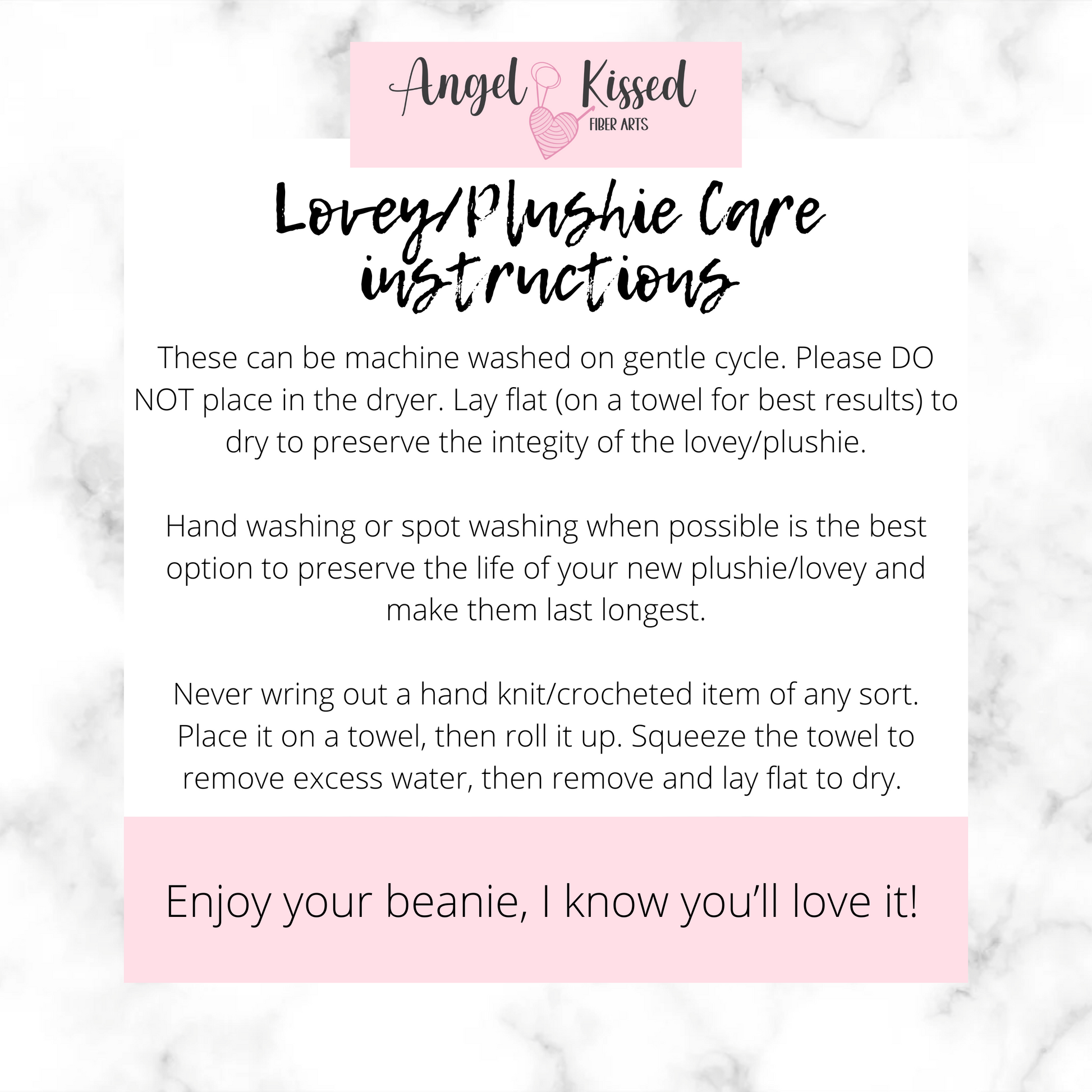 May be machine washed in cold water on gentle cycle, but hand washing may extend the life of the toy. Lay flat to dry for best care and to maintain the life of your snuggler.